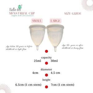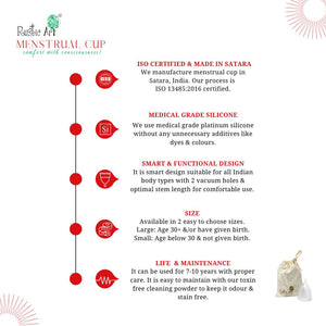 Find joy in little things, everyone says! And we help you find that joy. Rustic Art menstrual cup is as small as a cup cake, sparking even more joy in women. Waking up to a new comfort everyday, Rustic Art Menstrual Cup is the treasure that we'd love to share with the world. Rustic Art Menstrual Cup is a reusable sanitary wear, which collects the menstrual fluids, 25-30 ml at a time. It's made out of medical grade silicone, which doesn't react with the either the body, or the vaginal fluids. Since it goes entirely inside the vagina, the ease of body movements is at the maximum, making it a pit stop for most of the sportswomen. It is smartly designed for most comfort and made in India (Satara, Maharashtra). It saves pollution caused due to the disposable pads, saves luggage storage while traveling, saves money, removes the irritation, itch and foul smell caused by the disposable pads. The cloth pouch is hand stitched by local women, providing them employment. Rustic Art Menstrual Cup Wash! Now say good bye to odour, stains and .... with your portable sterilizing kit! It takes care of the maintenance of your cup for 2 years. Use it once before your period and once after for a menstrual cup as good as new. It is made with natural and non toxic ingredients. You can buy it here.