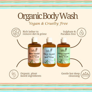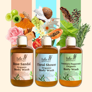 Rustic Art Organic Body Wash (Rose Sandal + Floral Shower + Rosemary Peppermint, 300 ml (Pack of 3)) with Jute Pouch Gift Pack